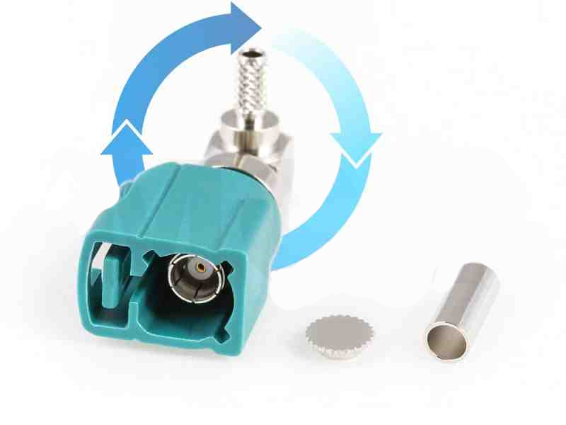 This FAKRA angle connector for RG 174 is designed to be rotatable.
