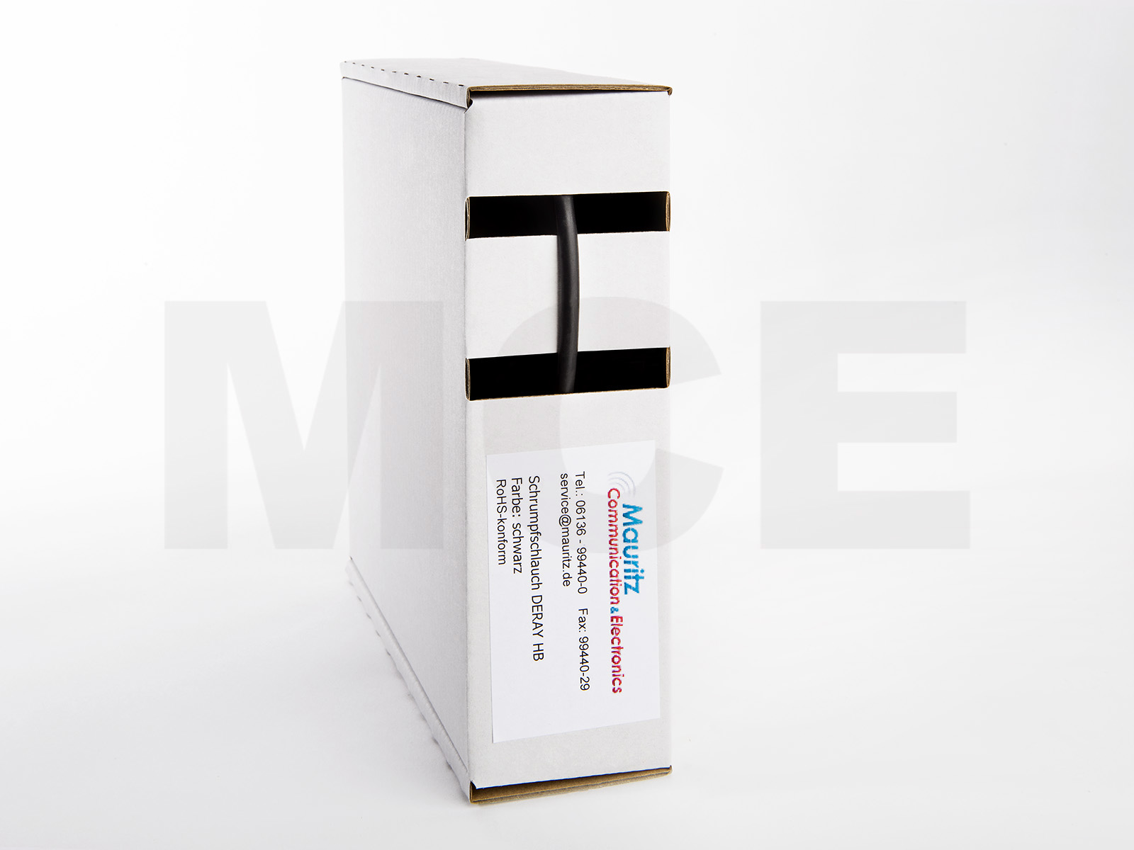 DERAY®-HB heat shrink tubing made of crosslinked polyolefin , color black, shrink ratio 2:1, thin wall, flexible, halogen-free, not flame retardant, not UL and CSA certified, shrinking at + 125°C and is for permanent use at temperatures of -55°C to +105°C is used and manufactured in Germany.